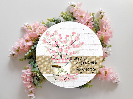 Bienvenido primavera flores de cerezo redondo impreso hecho a mano madera signo puerta suspensión