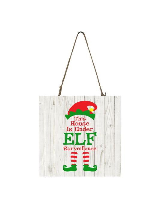 Señal pequeña de adorno navideño de madera hecho a mano con estampado de vigilancia de elfos