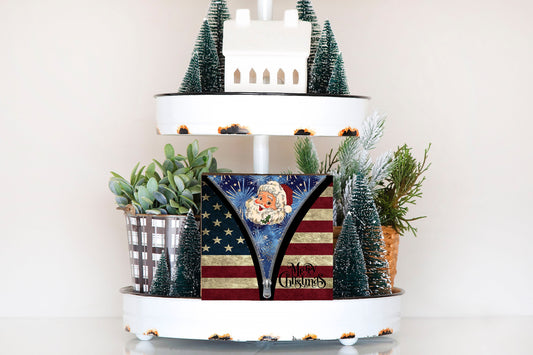 Bandera con cremallera Santa Patriótica Navidad impresa hecha a mano adorno de Navidad de madera Mini letrero