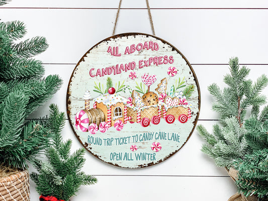 Todos a bordo del tren de dulces Navidad redondo impreso hecho a mano signo de madera, percha de puerta, signo de corona