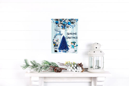 Letrero de madera hecho a mano con estampado navideño azul de Season's Greetings