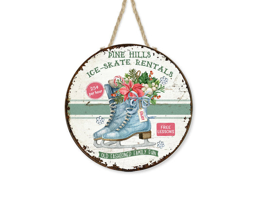 New Release Pine Hills Ice Skating Christmas Round Printed Handmade Wood Sign Farmhouse Door Hanger Wreath Sign