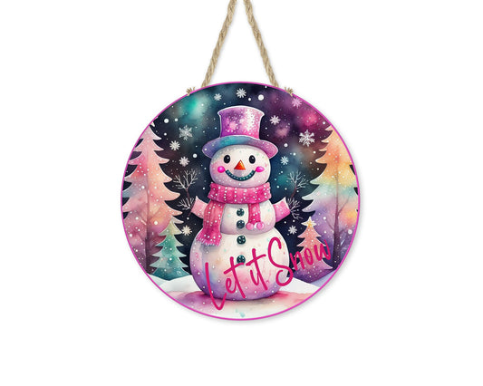 New Release Pink Snowman Let it Snow Sign, Farmhouse Christmas Round Wood Sign Farmhouse Door Hanger Wreath Sign