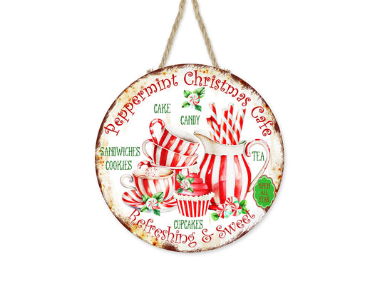 New Release Peppermint Cafe Sign, Farmhouse Christmas Round Wood Sign, Door Hanger Wreath Sign