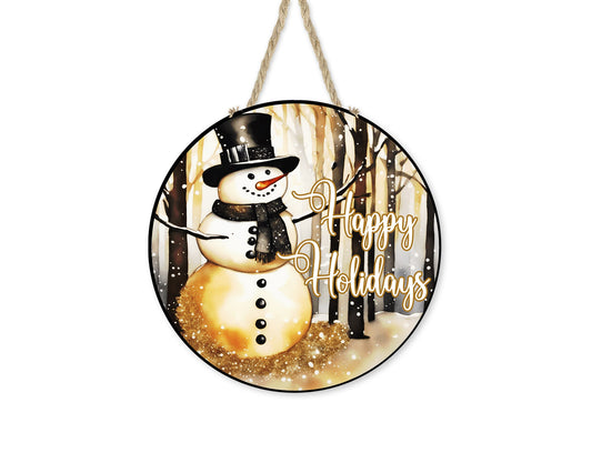 New Release Happy Holidays Gold Snowman Sign, Farmhouse Christmas Round Wood Sign Farmhouse Door Hanger Wreath Sign