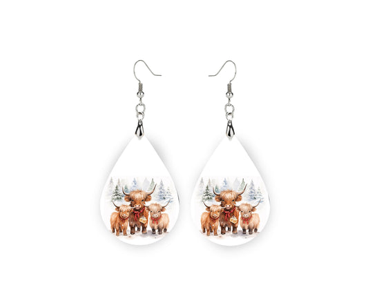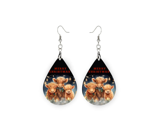 New Release Christmas Highland Cow, Tear Drop Dangle Printed Earrings Jewelry Handmade