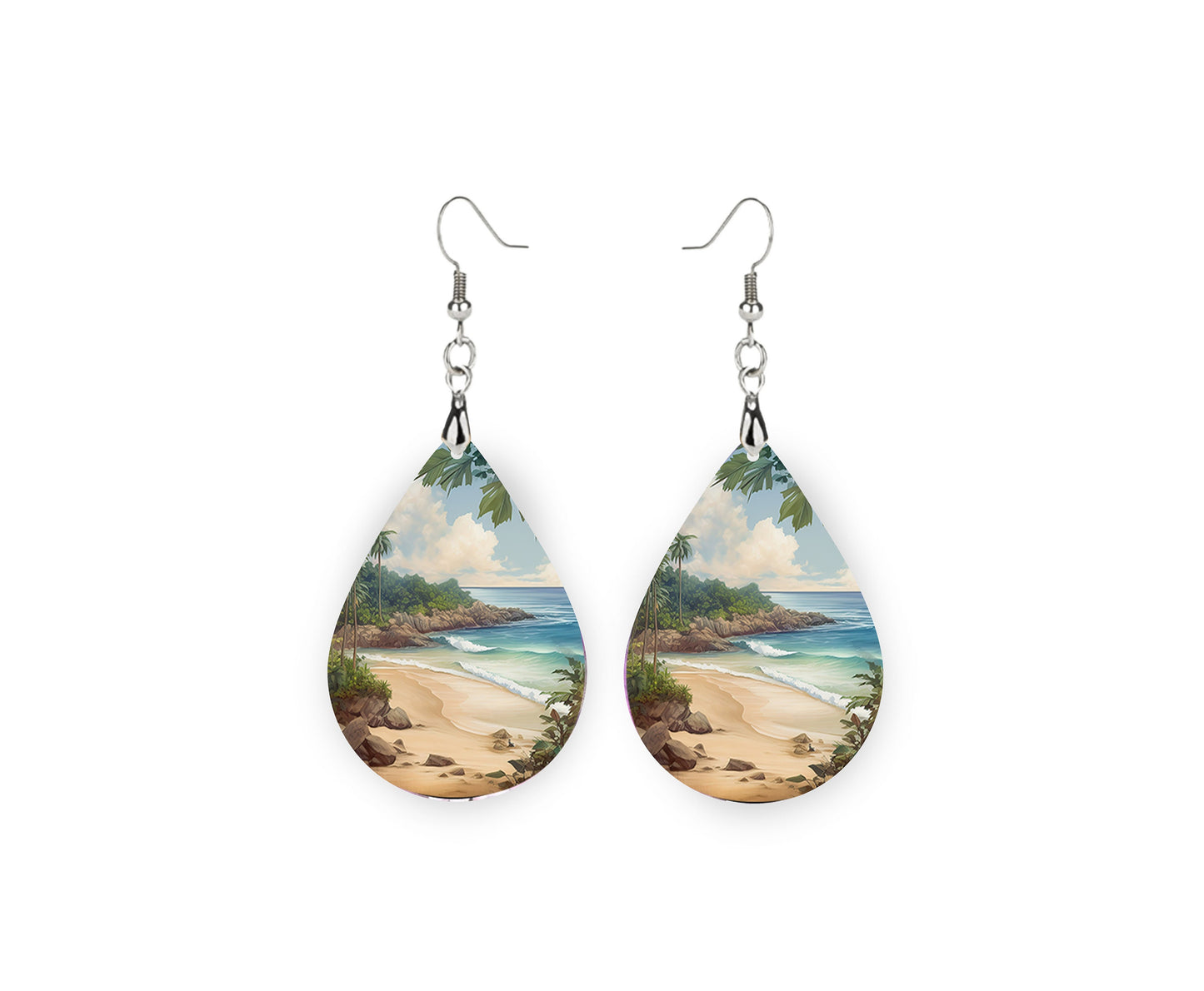 Beach Earrings, Beach Coastline Print Tear Drop Wood Dangle Earrings Hypoallergenic Jewelry